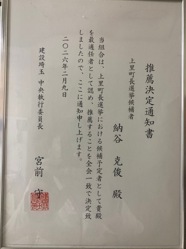 令和4年4月まで5期20年、町議会議員として皆様方には大変お世話になりました。特別委員会委員長として「上里町議会基本条例」、「上里町議会議員政治倫理条例」の制定や関連例規を改正することができ、町議としての活動に区切りをつけ令和4年4月に執り行われた上里町長選挙に立候補いたしました。
