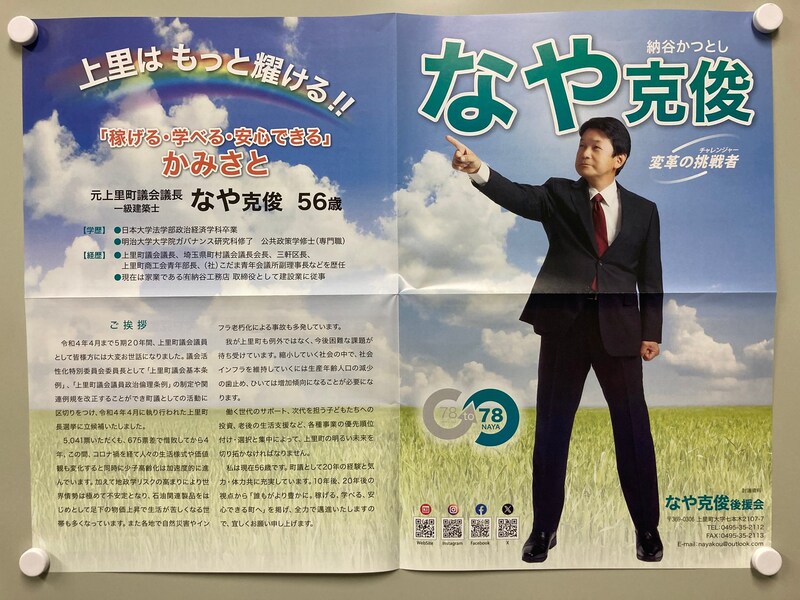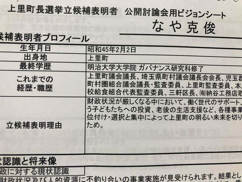 令和4年4月まで5期20年間、上里町議会議員として皆様方には大変お世話になりました。議会活性化特別委員会委員長として「上里町議会基本条例」、「上里町議会議員政治倫理条例」の制定や関連例規を改正することができ町議としての活動に区切りをつけ、令和4年4月に執り行われた上里町長選挙に立候補いたしました。